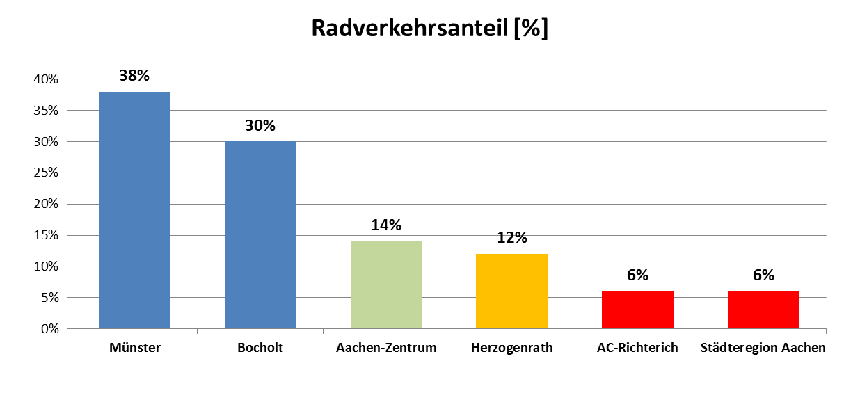 Radfahren wird derzeit immer beliebter. Geringer Platzverbrauch, Vermeidung von Schadstoffen und Lärm, die Belebung der Innenstädte sowie gesundheitliche Aspekte sprechen dafür. Aachen, Herzogenrath und die StädteRegion fördern den Radverkehr aktiv seit Ende der 1980er Jahre. Hierdurch konnte der Radverkehrsanteil zwar stabilisiert werden, allerdings zeigen die aktuellen Zahlen (Aachen = 11 Prozent, Herzogenrath = 12 Prozent), dass die Radverkehrsanteile noch ausbaufähig sind. Dies ist auch insofern von Bedeutung, als dass das Radfahren auch noch besonders preiswert und auch für diejenigen mit schmalem Geldbeutel erschwinglich ist.
